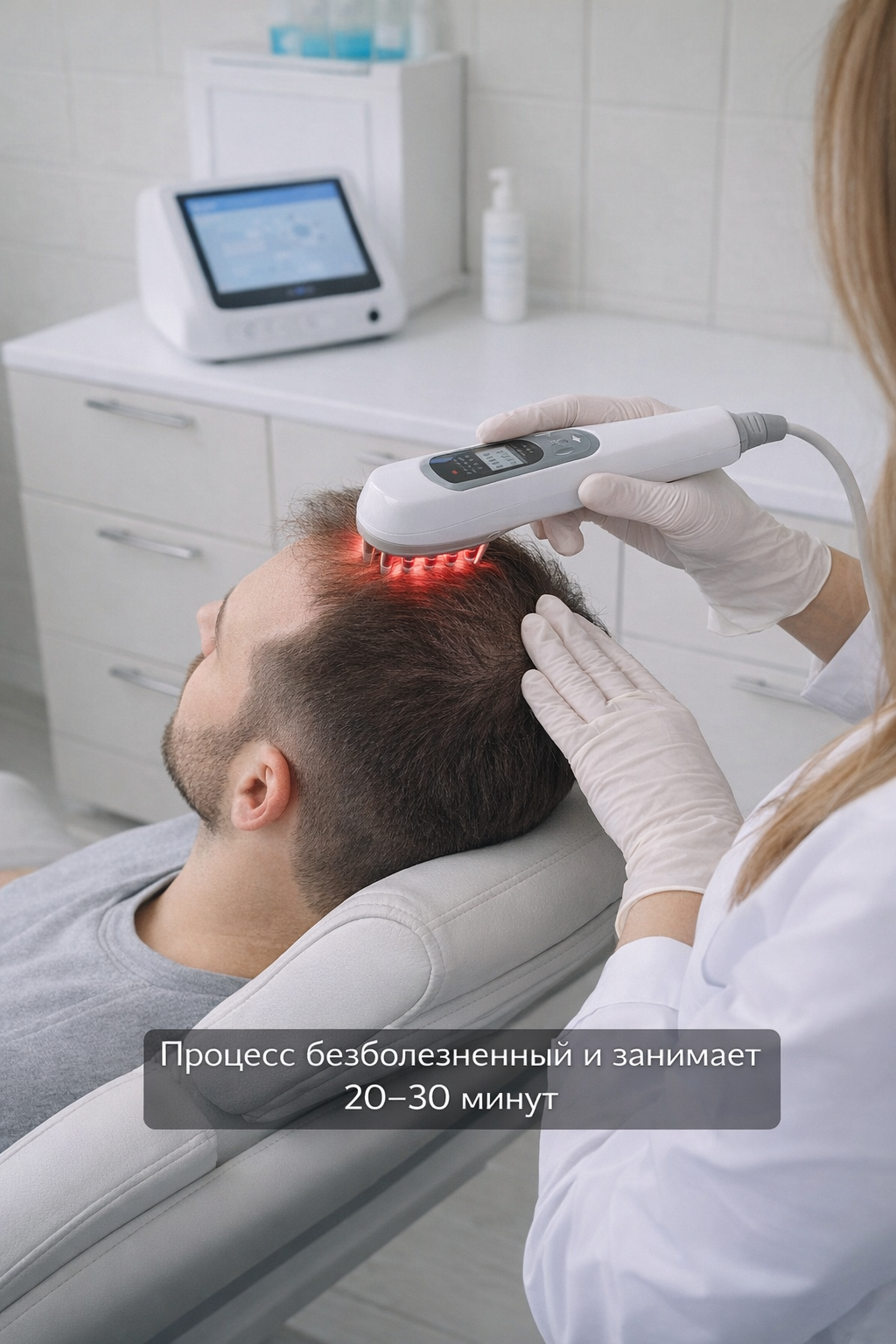Пациент удобно располагается в кресле. Врач обрабатывает кожу головы лазерной насадкой по проборам. Процедура занимает 20-30 минут и ощущается как легкое, приятное тепло. Это абсолютно безболезненно.