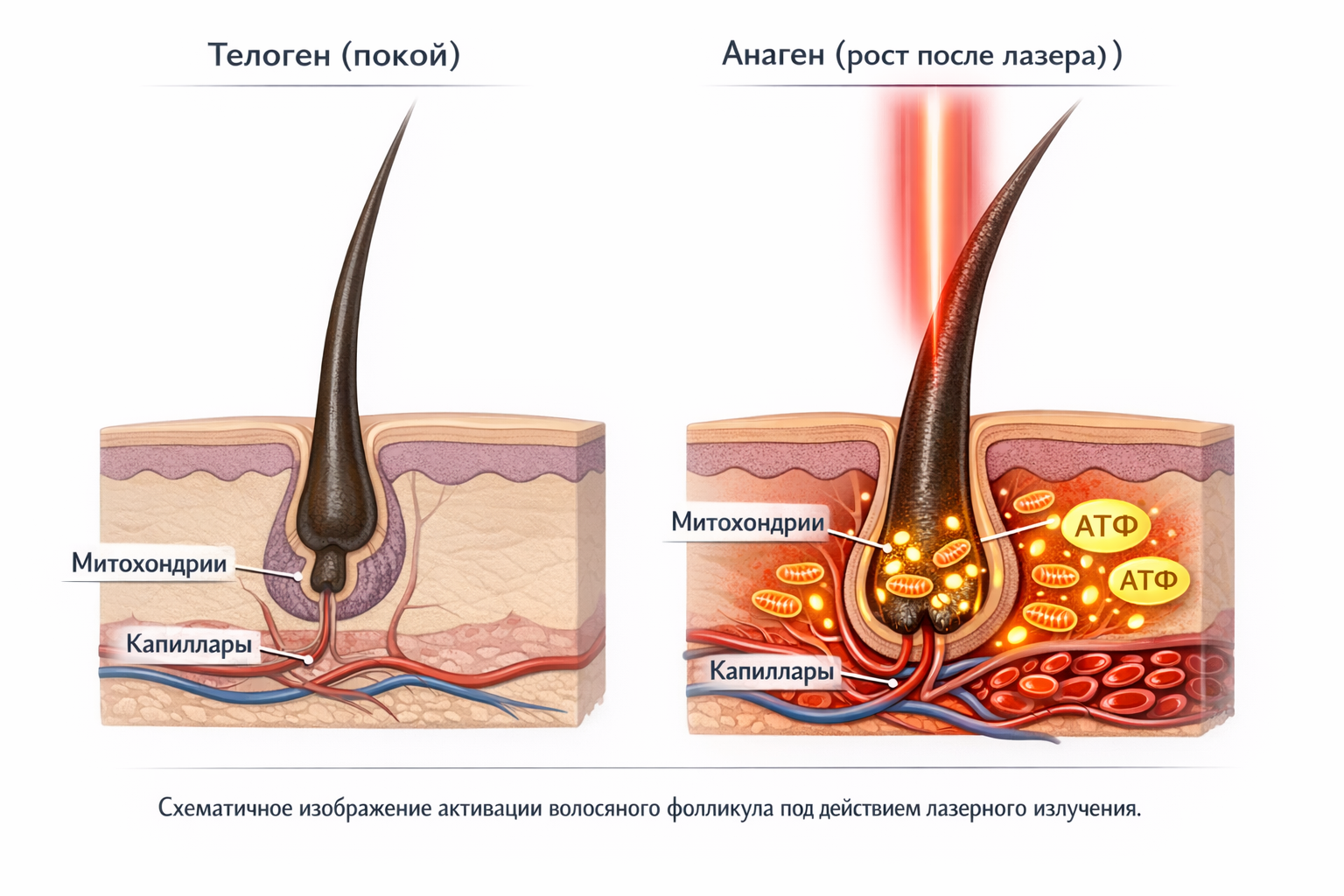 Лазерное излучение активирует каскад реакций на клеточном уровне, начиная с поглощения света митохондриями. Фотобиомодуляция запускает производство энергии, что переводит фолликулы из фазы покоя в фазу роста.
